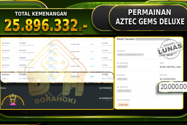 Bukti JP Aztec Gems Deluxe – ucapkan selamat kepada user id Menxxxx atas kemenangan di Aztec Gems Deluxe dengan total kemenangan Rp.25.896.332,- Yang pasti nya langsung LUNAS Sesuai Bukti. Kemenangan Berapapun Situs DoraHoki Akan Membayar Lunas ya