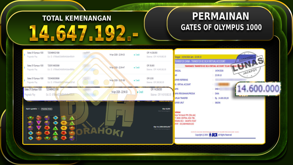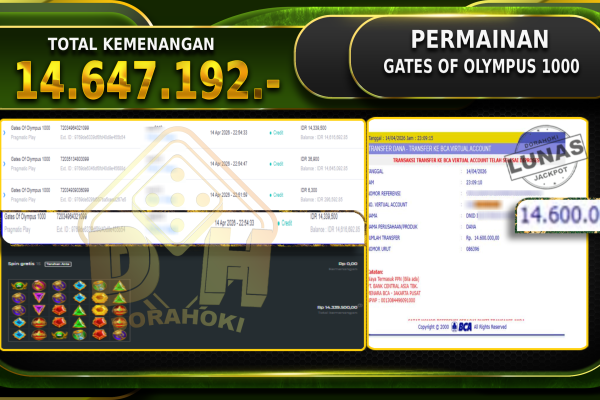 Bukti JP GATES OF OLYMPUS 1000 – ucapkan selamat kepada user id Vanxxxxx atas kemenangan di GATES OF OLYMPUS 1000 dengan total kemenangan Rp.14.647.192,- . Yang pasti nya langsung LUNAS Sesuai Bukti. Kemenangan Berapapun Situs DoraHoki Akan Membayar Lunas ya