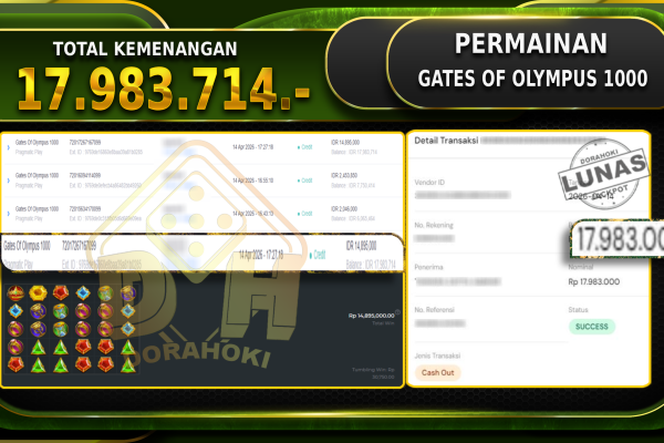 Bukti JP GATES OF OLYMPUS 1000 – ucapkan selamat kepada user id Bigxxxxx atas kemenangan di GATES OF OLYMPUS 1000 dengan total kemenangan Rp.17.983.714,- . Yang pasti nya langsung LUNAS Sesuai Bukti. Kemenangan Berapapun Situs DoraHoki Akan Membayar Lunas ya