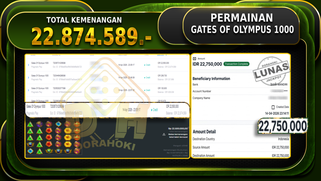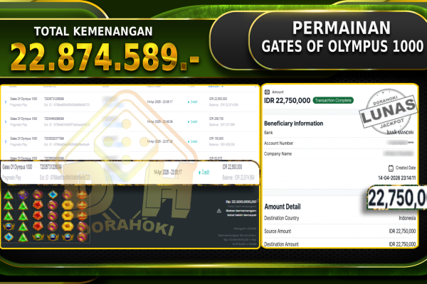 Bukti JP GATES OF OLYMPUS 1000 – ucapkan selamat kepada user id Pamxxxxx atas kemenangan di GATES OF OLYMPUS 1000 dengan total kemenangan Rp.22.874.589,- . Yang pasti nya langsung LUNAS Sesuai Bukti. Kemenangan Berapapun Situs DoraHoki Akan Membayar Lunas ya