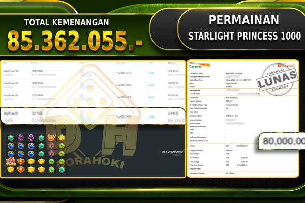 Bukti JP Starlight Princess 1000 – Selamat Kepada User ID : Jitxx atas kemenangan Starlight Princess 1000 Dengan Nominal Sebesar Rp.85.362.055,- Yang pasti nya langsung LUNAS Sesuai Bukti. Kemenangan Berapapun Situs DoraHoki Akan Membayar Lunas ya