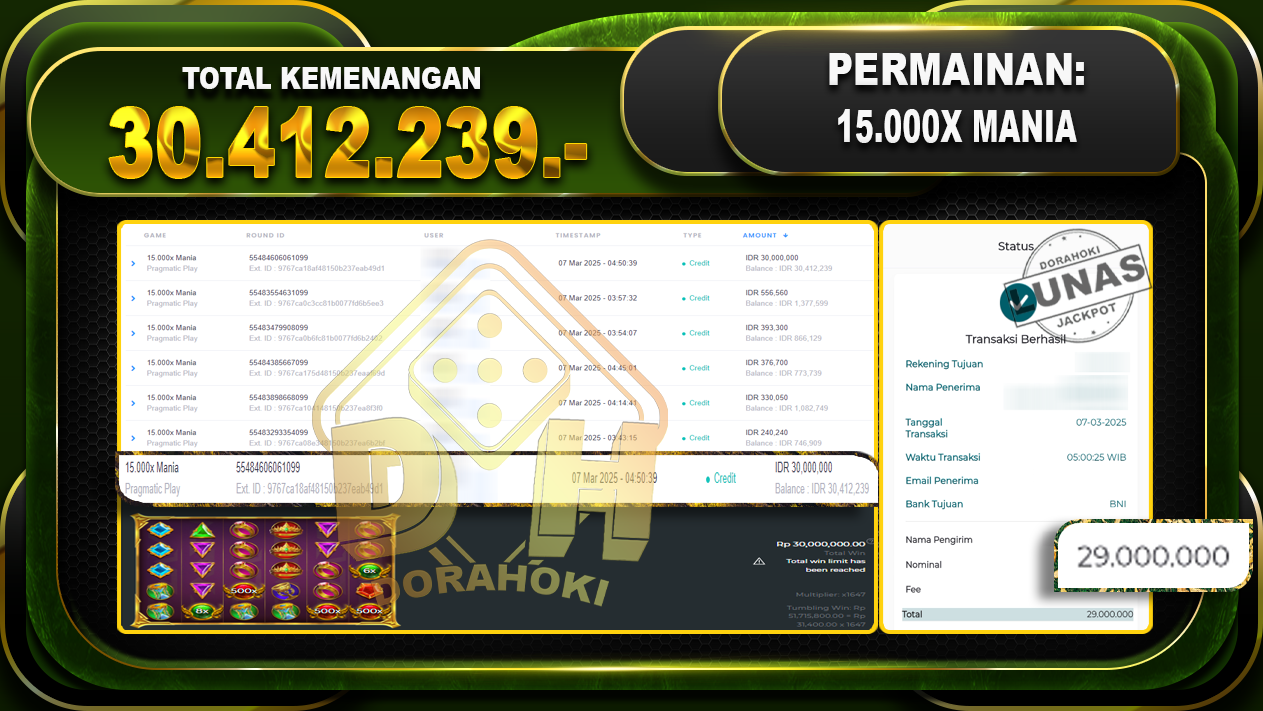 Bukti JP 15.000x Mania – ucapkan selamat kepada user id Dikxxx atas kemenangan di 15.000x Mania dengan total kemenangan Rp.30.412.239,- . Yang pasti nya langsung LUNAS sesuai bukti ya bosku. Dorahoki nih bosku berapapun akan tetap kami bayar lunas ya bosku.