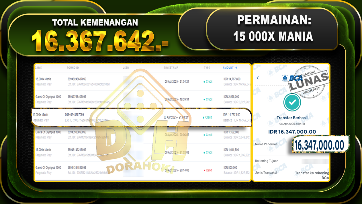 Bukti JP 15.000x Mania – ucapkan selamat kepada user id Sugxxx atas kemenangan di 15.000x Mania dengan total kemenangan Rp.16.367.642,- . Yang pasti nya langsung LUNAS sesuai bukti ya bosku. Dorahoki nih bosku berapapun akan tetap kami bayar lunas ya bosku.