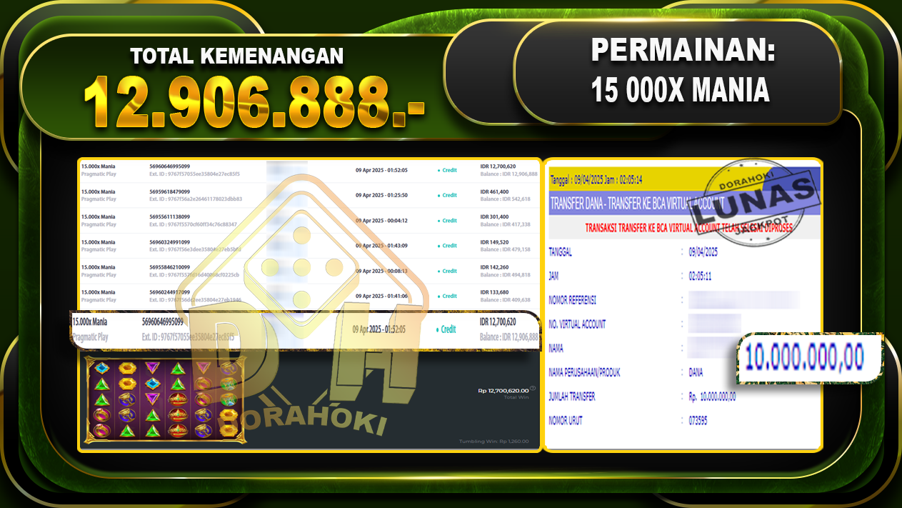 Bukti JP 15.000x Mania – ucapkan selamat kepada user id Abixxx atas kemenangan di 15.000x Mania dengan total kemenangan Rp.12.906.888,- . Yang pasti nya langsung LUNAS sesuai bukti ya bosku. Dorahoki nih bosku berapapun akan tetap kami bayar lunas ya bosku.