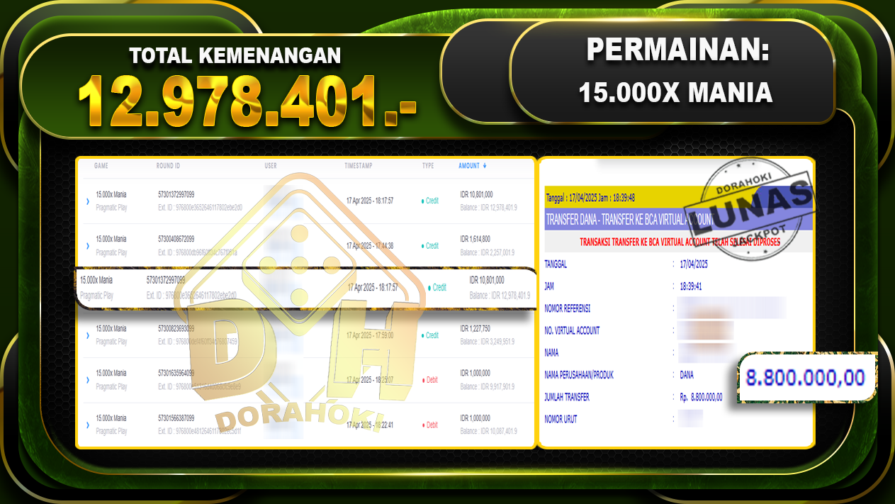 Bukti JP 15.000x Mania – ucapkan selamat kepada user id Apixxx atas kemenangan di 15.000x Mania dengan total kemenangan Rp.12.978.401,- . Yang pasti nya langsung LUNAS sesuai bukti ya bosku. Dorahoki nih bosku berapapun akan tetap kami bayar lunas ya bosku.