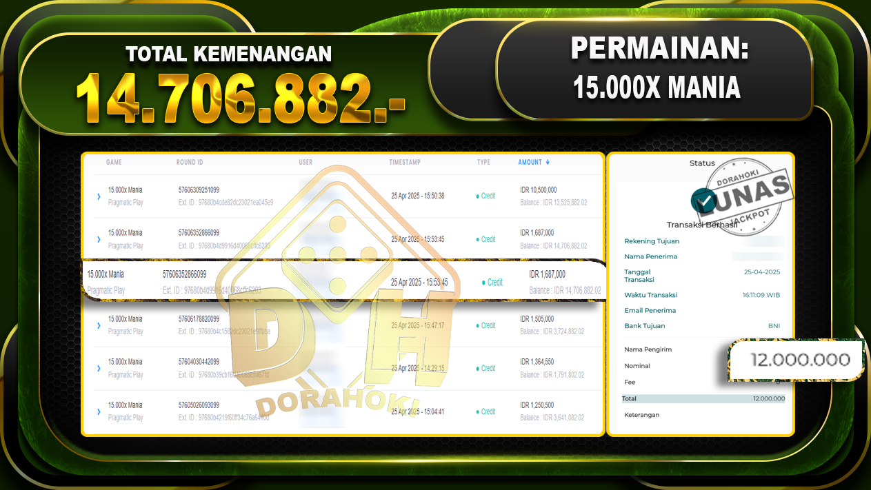 Bukti JP 15.000x Mania – ucapkan selamat kepada user id Deoxxx atas kemenangan di 15.000x Mania dengan total kemenangan Rp.14.706.882,- . Yang pasti nya langsung LUNAS sesuai bukti ya bosku. Dorahoki nih bosku berapapun akan tetap kami bayar lunas ya bosku.