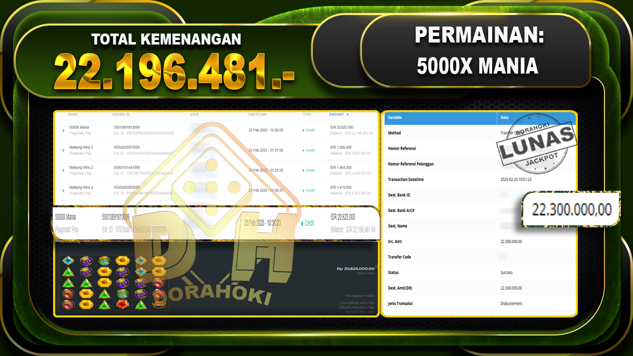 Bukti JP 15000X MANIA – ucapkan selamat kepada user id tubohokxxx atas kemenangan di 15000X MANIA dengan total kemenangan Rp.22.196.481,- . Yang pasti nya langsung LUNAS sesuai bukti ya bosku. Dorahoki nih bosku berapapun akan tetap kami bayar lunas ya bosku.