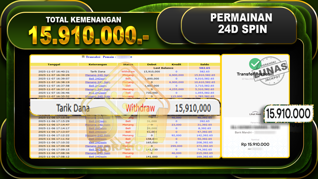Bukti JP 24D SPIN – ucapkan selamat kepada user id rajxxxx atas kemenangan di  24D SPIN dengan total kemenangan Rp.15.910.000,- Yang pasti nya langsung LUNAS sesuai bukti ya bosku. Dorahoki nih bosku berapapun akan tetap kami bayar lunas ya bosku.