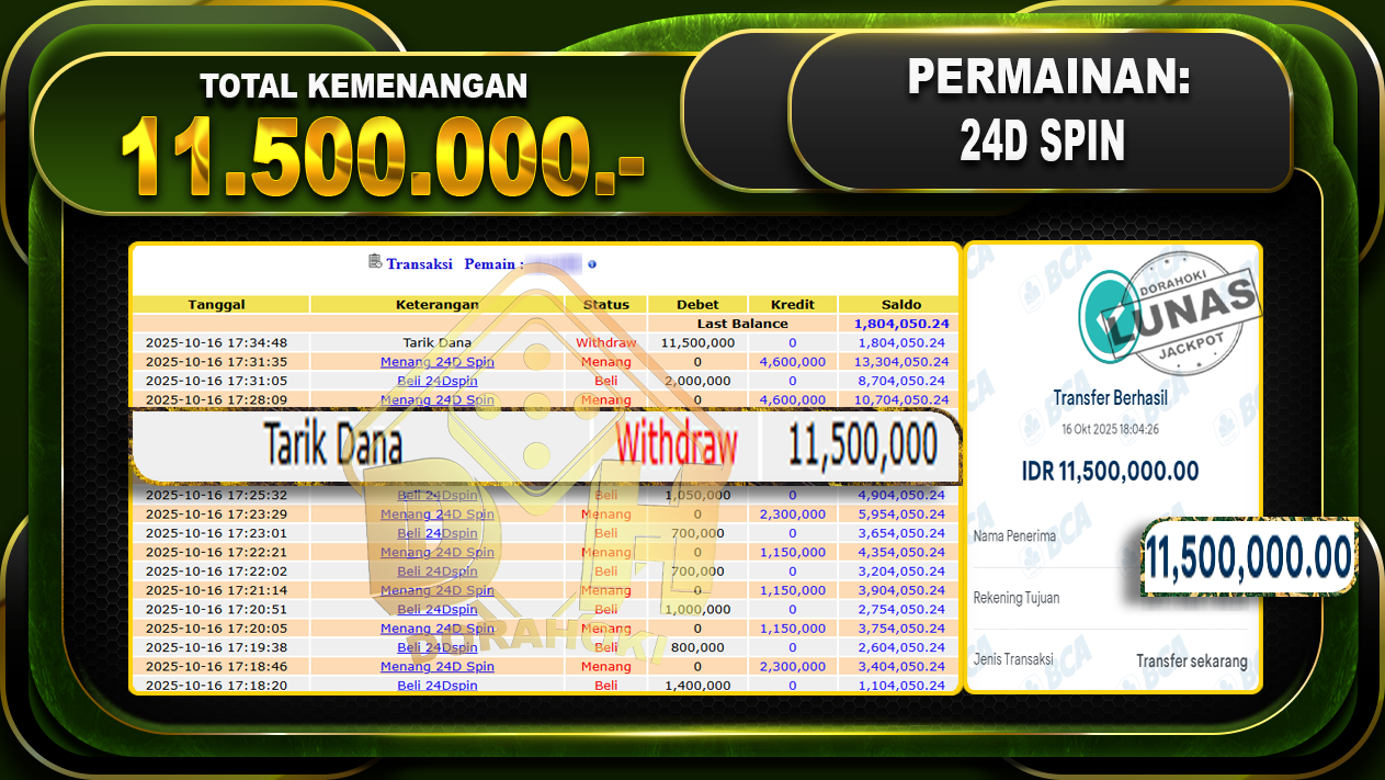 Bukti JP 24D SPIN – ucapkan selamat kepada user id junxxxx atas kemenangan di 24D SPIN dengan total kemenangan Rp.11.500.000,- Yang pasti nya langsung LUNAS sesuai bukti ya bosku. Dorahoki nih bosku berapapun akan tetap kami bayar lunas ya bosku.