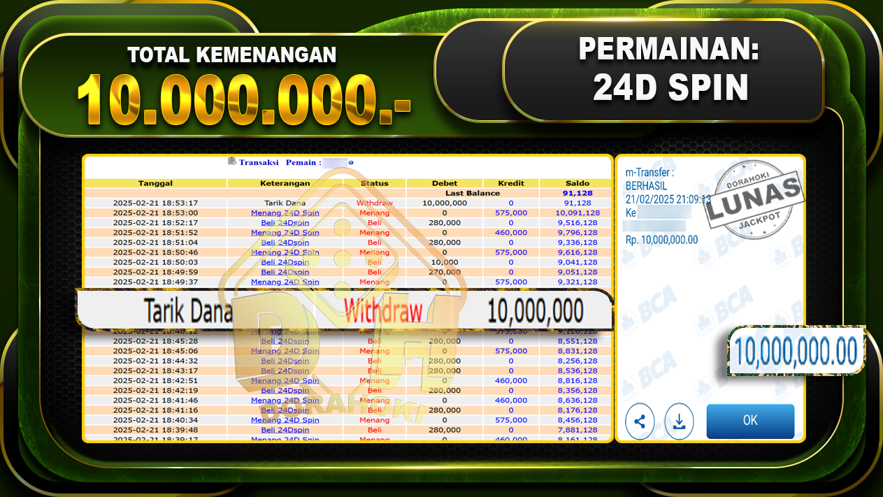 Bukti JP 24D SPIN- ucapkan selamat kepada user id gixxx atas kemenangan di 24D SPIN dengan total kemenangan Rp.10.000.000,- . Yang pasti nya langsung LUNAS sesuai bukti ya bosku. Dorahoki nih bosku berapapun akan tetap kami bayar lunas ya bosku.