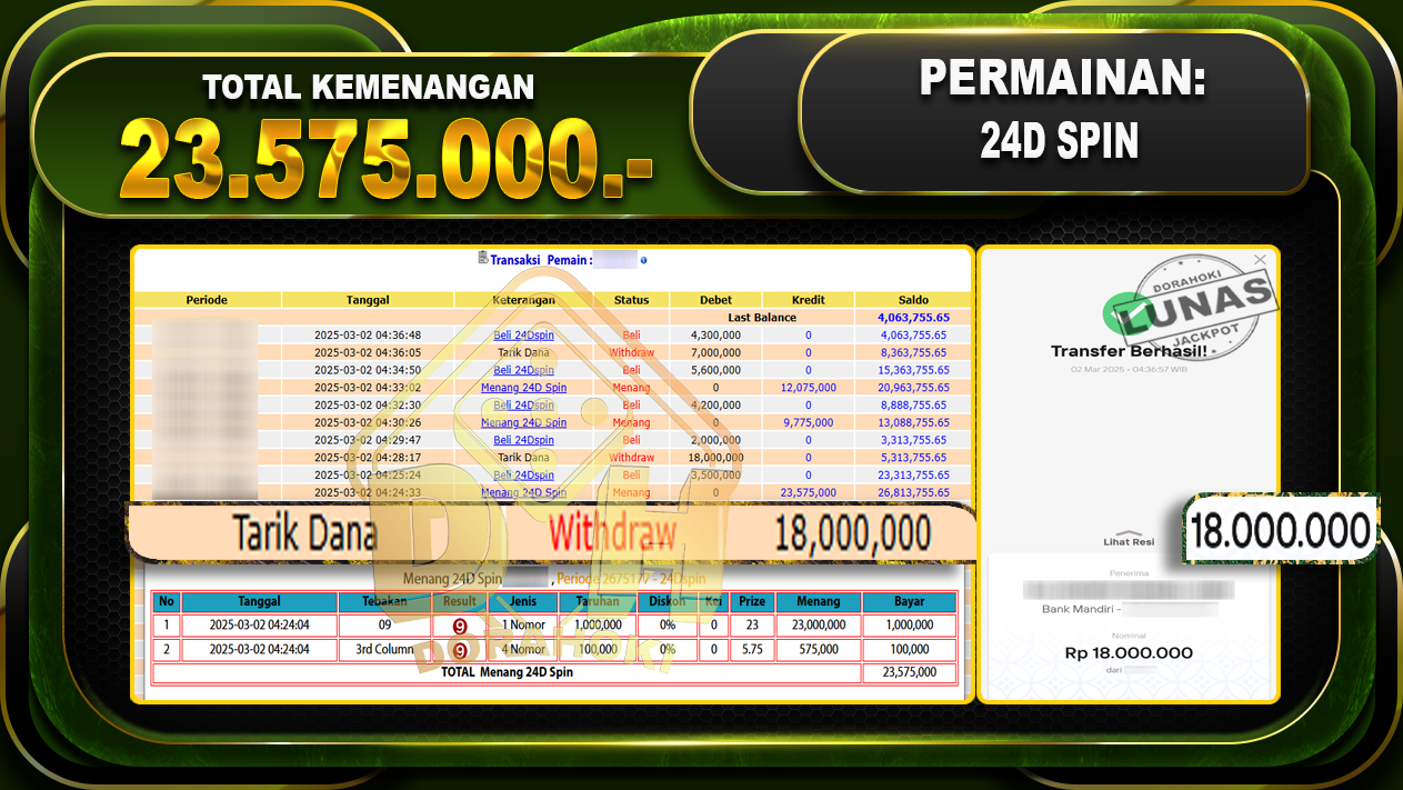 Bukti JP 24Dspin – ucapkan selamat kepada user id Rajxxx atas kemenangan di 24Dspin dengan total kemenangan Rp.23.575.000,- . Yang pasti nya langsung LUNAS sesuai bukti ya bosku. Dorahoki nih bosku berapapun akan tetap kami bayar lunas ya bosku.