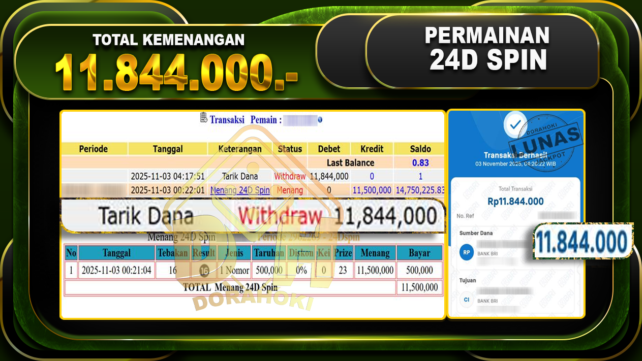 Bukti JP 24Dspin – ucapkan selamat kepada user id sakxxxxx atas kemenangan di HONGKONG dengan total kemenangan Rp.11.844.000- . Yang pasti nya langsung LUNAS sesuai bukti ya bosku. Dorahoki nih bosku berapapun akan tetap kami bayar lunas ya bosku.