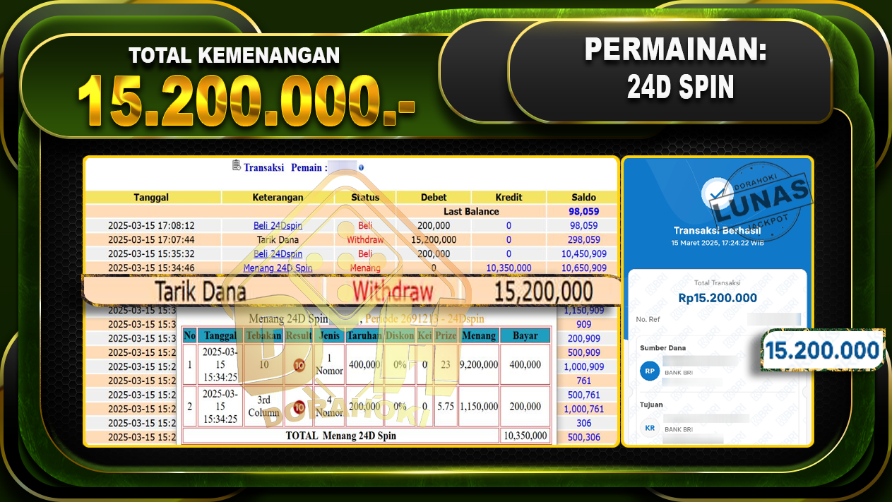 Bukti JP 24Dspin – ucapkan selamat kepada user id Kalxxx atas kemenangan di 24Dspin dengan total kemenangan Rp.15.200.000,- . Yang pasti nya langsung LUNAS sesuai bukti ya bosku. Dorahoki nih bosku berapapun akan tetap kami bayar lunas ya bosku.
