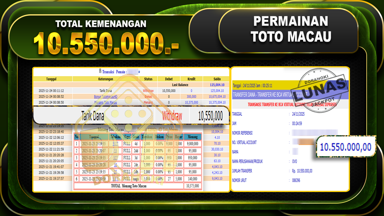 Bukti JP TOGEL TOTO MACAU 4D – ucapkan selamat kepada user id bogxxxxx atas kemenangan di  TOGEL TOTO MACAU 4D dengan total kemenangan Rp.10,550,000,- Yang pasti nya langsung LUNAS sesuai bukti ya bosku. Dorahoki nih bosku berapapun akan tetap kami bayar lunas ya bosku