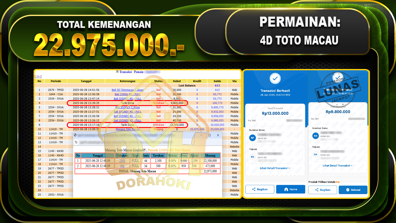 Bukti JP 4D TOTO MACAU – ucapkan selamat kepada user id KIMxxx atas kemenangan di 4D TOTO MACAU dengan total kemenangan Rp.22.975.000,- . Yang pasti nya langsung LUNAS sesuai bukti ya bosku. Dorahoki nih bosku berapapun akan tetap kami bayar lunas ya bosku.