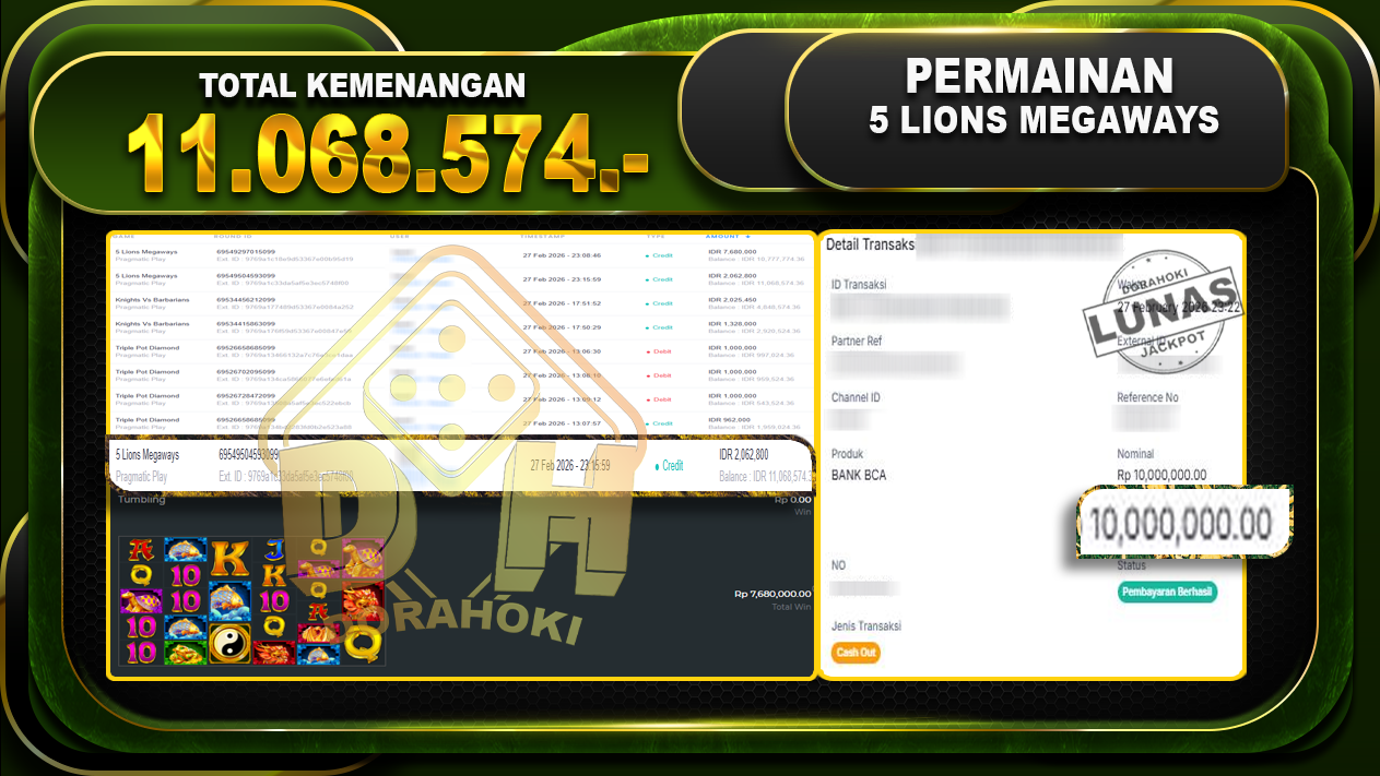 Bukti JP 5 LIONS MEGAWAYS – ucapkan selamat kepada user id Bawxxx atas kemenangan di 5 LIONS MEGAWAYS dengan total kemenangan Rp.11.068.574,- . Yang pasti nya langsung LUNAS Sesuai Bukti.