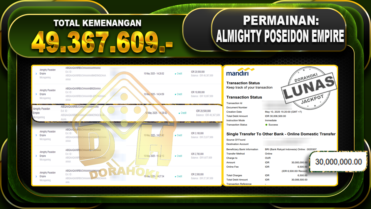 Bukti ALMIGHT POSEIDON EMPIRE ucapkan selamat kepada user id Prixxx atas kemenangan di  ALMIGHT POSEIDON EMPIRE  dengan total kemenangan Rp.49.367.609,- . Yang pasti nya langsung LUNAS sesuai bukti ya bosku. Dorahoki nih bosku berapapun akan tetap kami bayar lunas ya bosku.