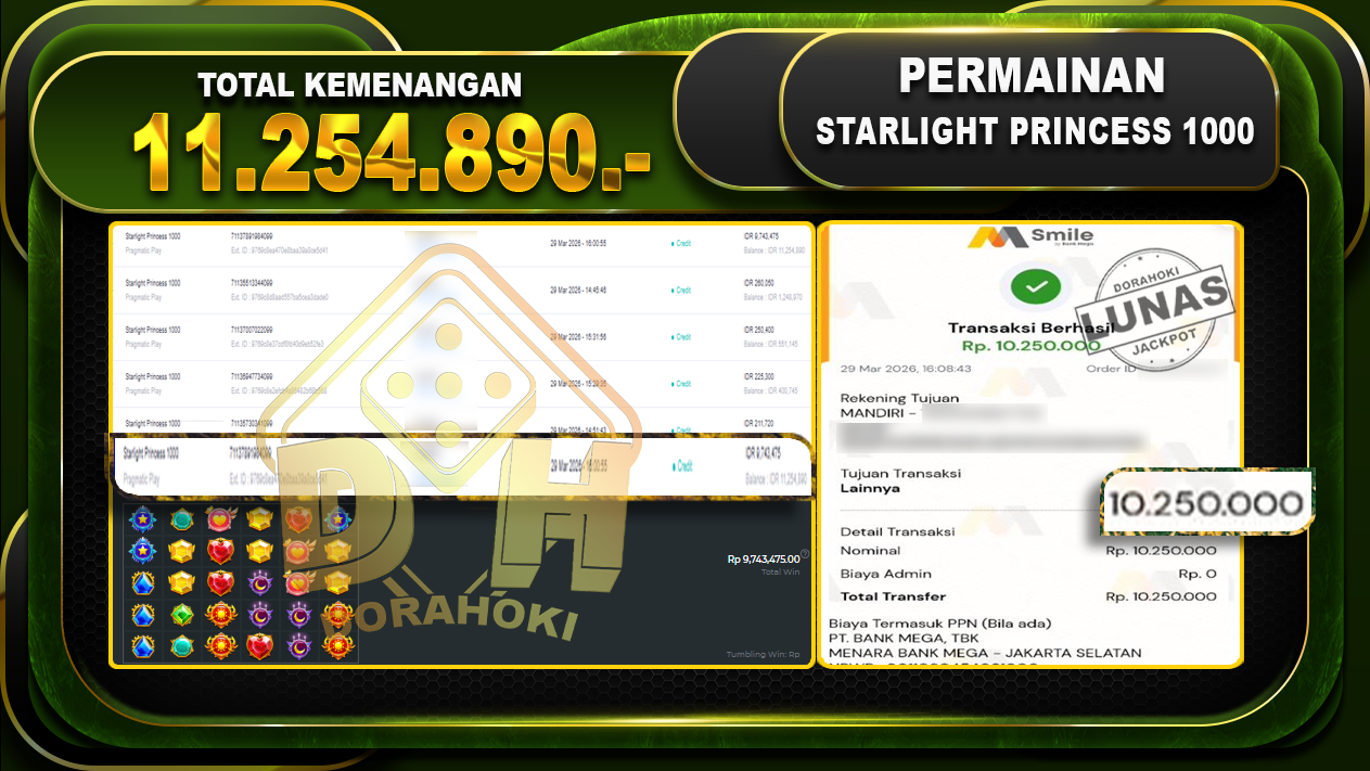 Bukti JP Starlight Princess 1000 – Selamat Kepada User ID : Elixxxx atas kemenangan Starlight Princess 1000 Dengan Nominal Sebesar Rp.11.254.890,- Yang pasti nya langsung LUNAS Sesuai Bukti.