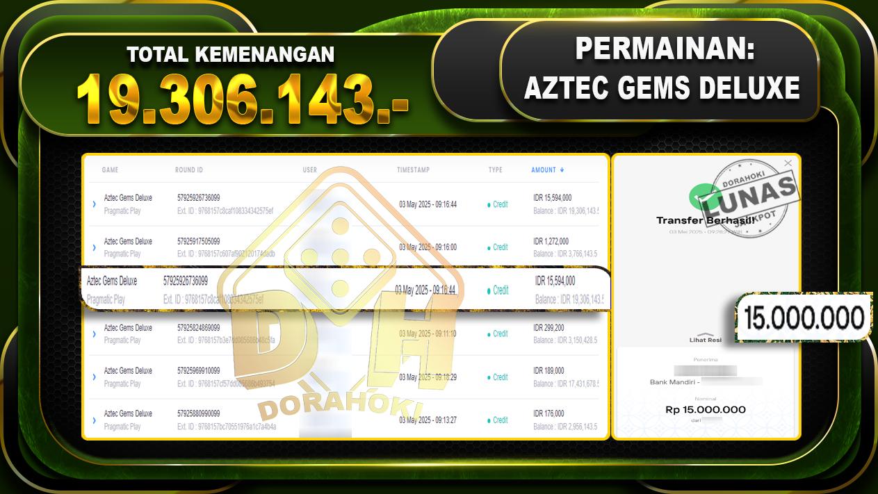 Bukti JP Aztec Gems Deluxe – ucapkan selamat kepada user id Menxxx atas kemenangan di Aztec Gems Deluxe dengan total kemenangan Rp.19.306.143,- . Yang pasti nya langsung LUNAS sesuai bukti ya bosku. Dorahoki nih bosku berapapun akan tetap kami bayar lunas ya bosku.