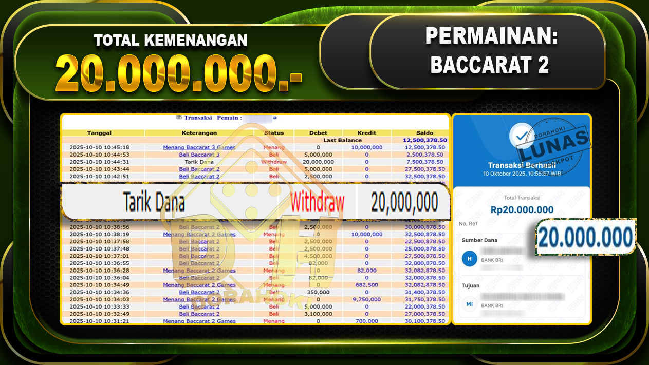 Bukti JP Baccarat 2 – ucapkan selamat kepada user id arkhxxxxxx atas kemenangan di Baccarat 2 dengan total kemenangan Rp.20.000.000- . Yang pasti nya langsung LUNAS sesuai bukti ya bosku. Dorahoki nih bosku berapapun akan tetap kami bayar lunas ya bosku.