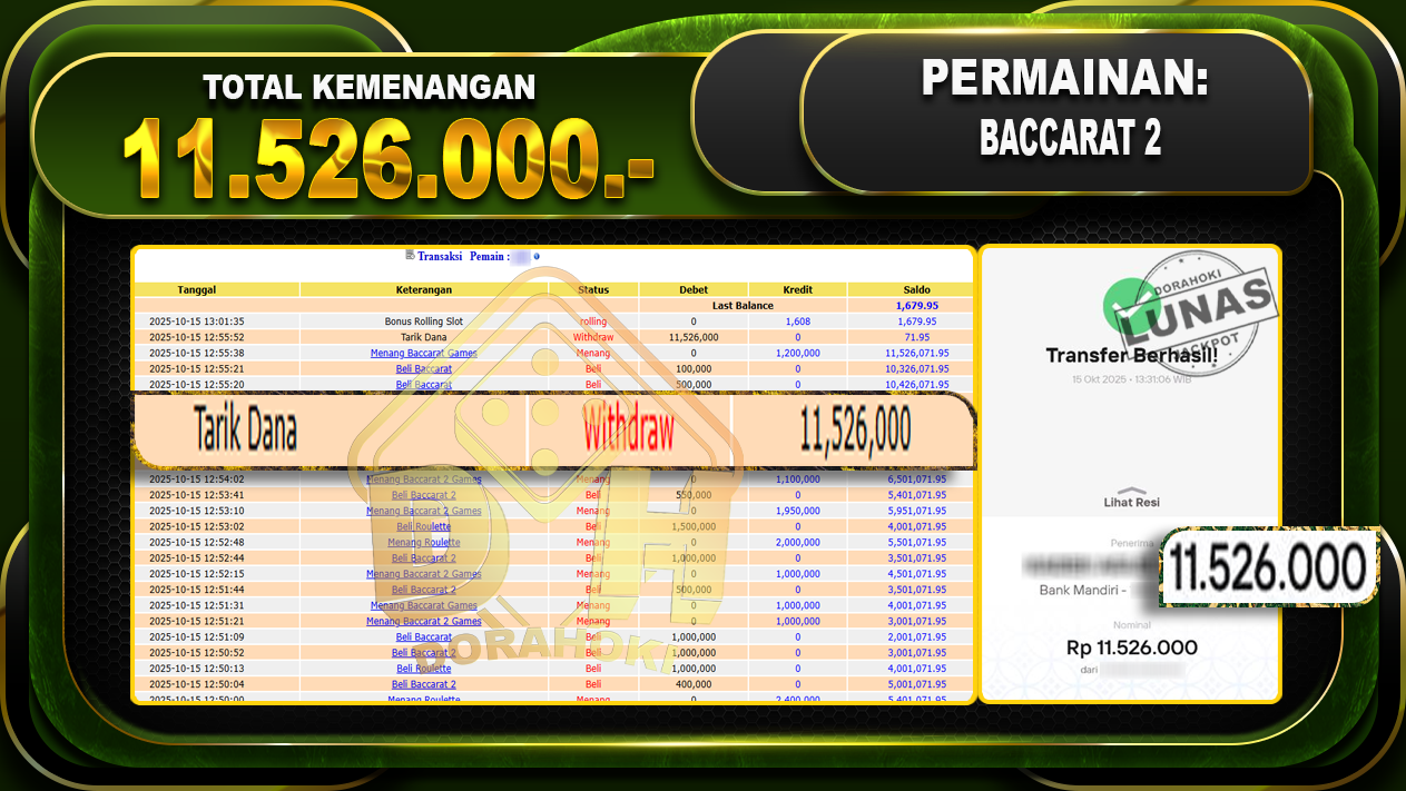 Bukti JP Baccarat 2 – ucapkan selamat kepada user id jixxxx atas kemenangan di Baccarat 2 dengan total kemenangan Rp.11.526.000- . Yang pasti nya langsung LUNAS sesuai bukti ya bosku. Dorahoki nih bosku berapapun akan tetap kami bayar lunas ya bosku.