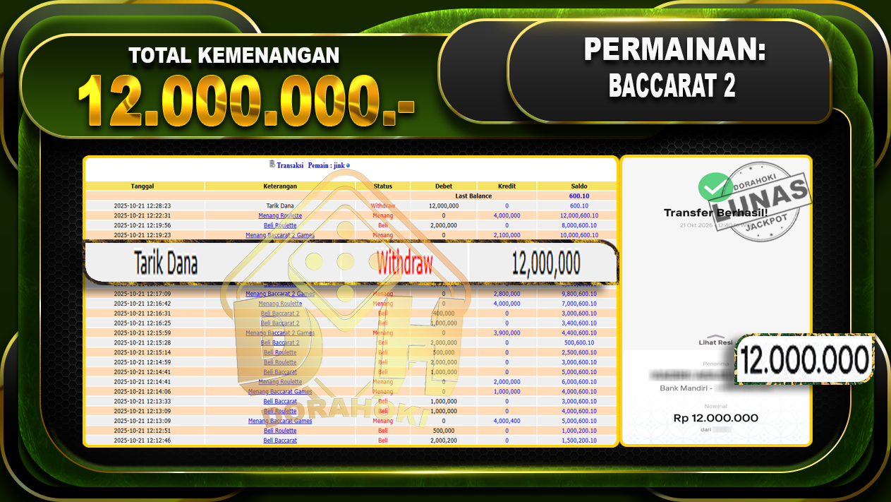 Bukti JP Baccarat 2 – ucapkan selamat kepada user id jixxx atas kemenangan di Baccarat 2 dengan total kemenangan Rp.12.000.000- . Yang pasti nya langsung LUNAS sesuai bukti ya bosku. Dorahoki nih bosku berapapun akan tetap kami bayar lunas ya bosku.