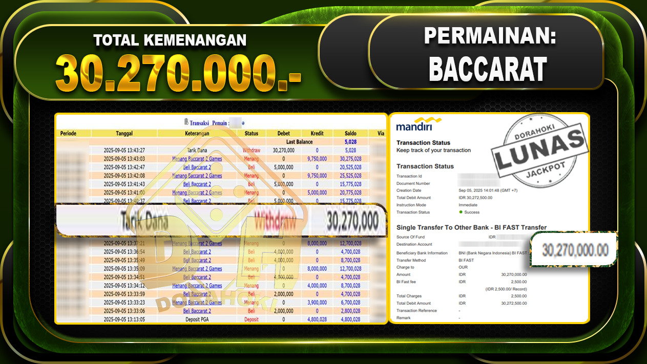 Bukti JP BACCARAT 2 GAMES- ucapkan selamat kepada user id Suxxx atas kemenangan di BACCARAT 2 GAMES dengan total kemenangan Rp.30.270.000,- . Yang pasti nya langsung LUNAS sesuai bukti ya bosku. Dorahoki nih bosku berapapun akan tetap kami bayar lunas ya bosku.