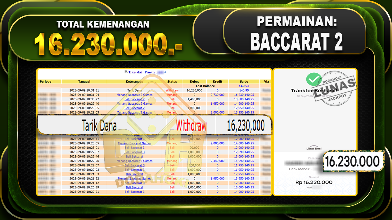 Bukti JP BACCARAT 2 GAMES- ucapkan selamat kepada user id Jixxx atas kemenangan di BACCARAT 2 GAMES dengan total kemenangan Rp.16.230.000,- . Yang pasti nya langsung LUNAS sesuai bukti ya bosku. Dorahoki nih bosku berapapun akan tetap kami bayar lunas ya bosku.