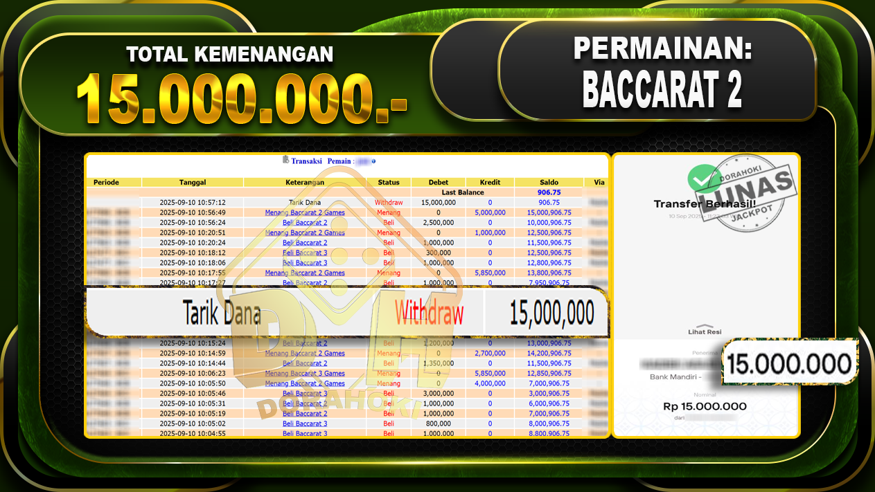 Bukti JP BACCARAT 2 GAMES- ucapkan selamat kepada user id Jixx atas kemenangan di BACCARAT 2 GAMES dengan total kemenangan Rp.15.000.000,- . Yang pasti nya langsung LUNAS sesuai bukti ya bosku. Dorahoki nih bosku berapapun akan tetap kami bayar lunas ya bosku.