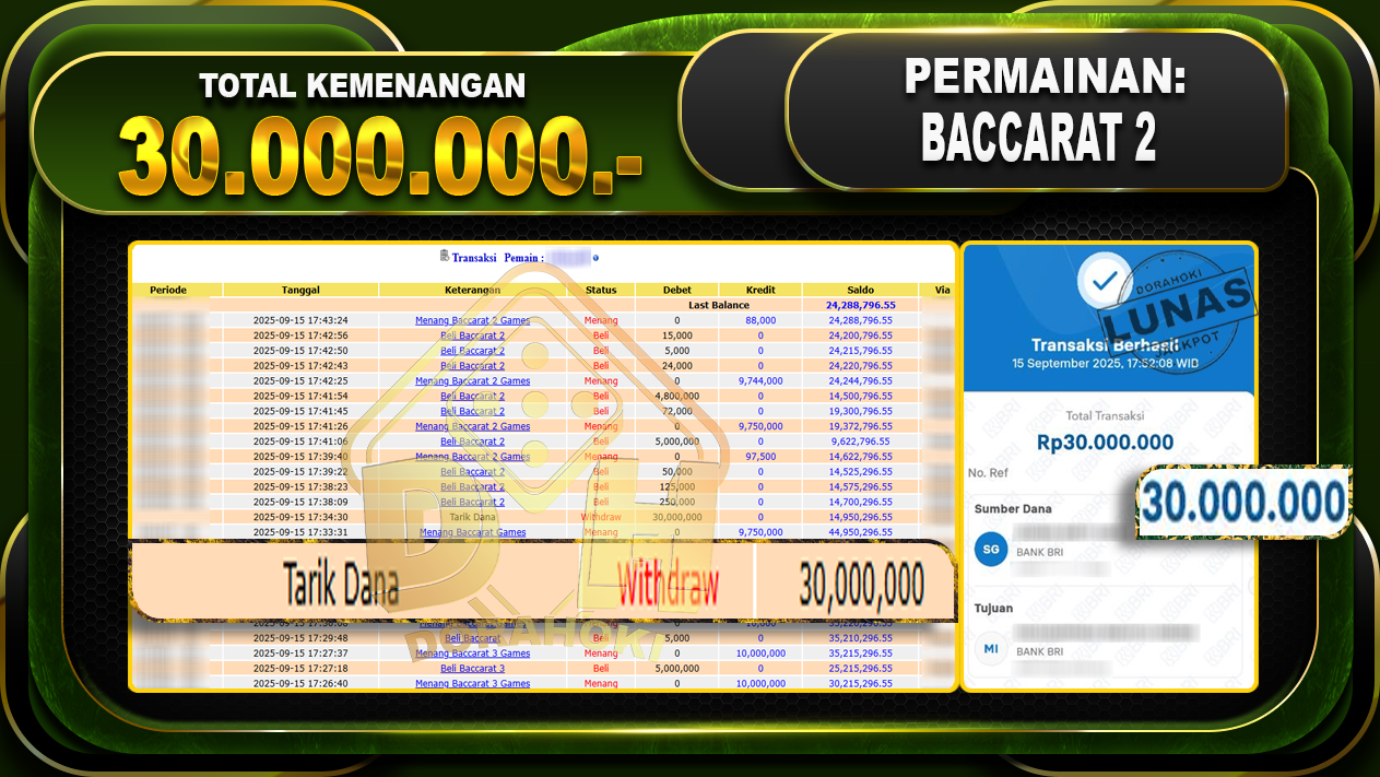 Bukti JP BACCARAT 2 GAMES- ucapkan selamat kepada user id Arkxxxxxx atas kemenangan di BACCARAT 2 GAMES dengan total kemenangan Rp.30,000.000,- . Yang pasti nya langsung LUNAS sesuai bukti ya bosku. Dorahoki nih bosku berapapun akan tetap kami bayar lunas ya bosku.
