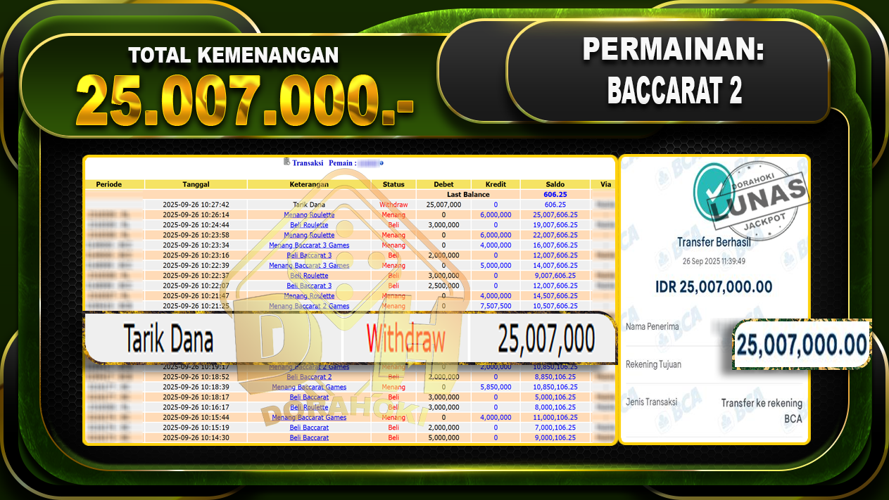 Bukti JP BACCARAT 2 GAMES- ucapkan selamat kepada user id asuxxxx atas kemenangan di BACCARAT 2 GAMES dengan total kemenangan Rp.25.007.000,- . Yang pasti nya langsung LUNAS sesuai bukti ya bosku. Dorahoki nih bosku berapapun akan tetap kami bayar lunas ya bosku.