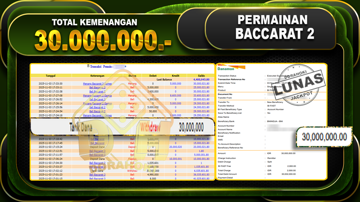 Bukti JP BACCARAT – ucapkan selamat kepada user id wahxxxx atas kemenangan di BACCARAT dengan total kemenangan Rp.30.000.000,- . Yang pasti nya langsung LUNAS sesuai bukti ya bosku. Dorahoki nih bosku berapapun akan tetap kami bayar lunas ya bosku.