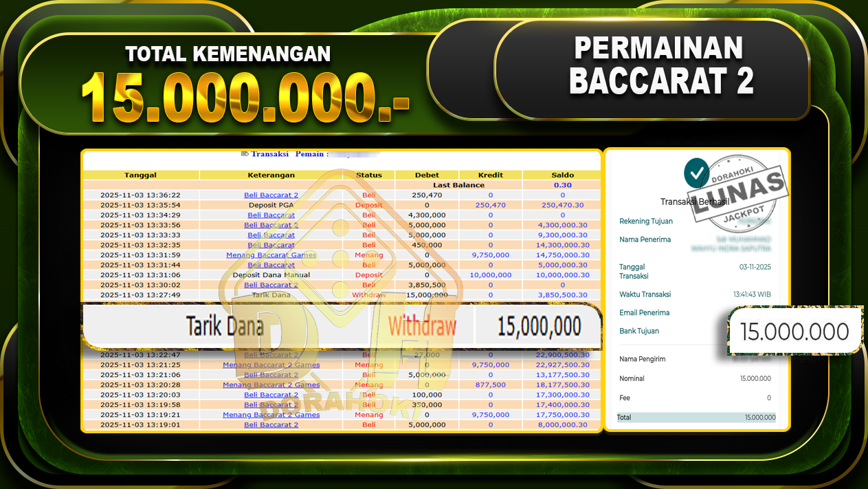 Bukti JP BACCARAT – ucapkan selamat kepada user id wahxxxx atas kemenangan di BACCARAT dengan total kemenangan Rp.15.500.000,- . Yang pasti nya langsung LUNAS sesuai bukti ya bosku. Dorahoki nih bosku berapapun akan tetap kami bayar lunas ya bosku.