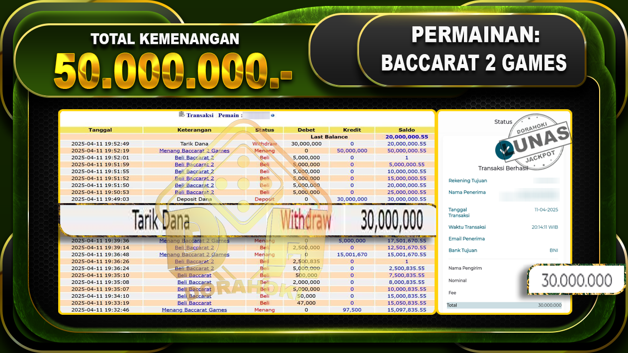 Bukti JP BACCARAT 2 GAMES – ucapkan selamat kepada user id Wahxxx atas kemenangan di  BACCARAT 2 GAMES  dengan total kemenangan Rp.50.000.000,- . Yang pasti nya langsung LUNAS sesuai bukti ya bosku. Dorahoki nih bosku berapapun akan tetap kami bayar lunas ya bosku.