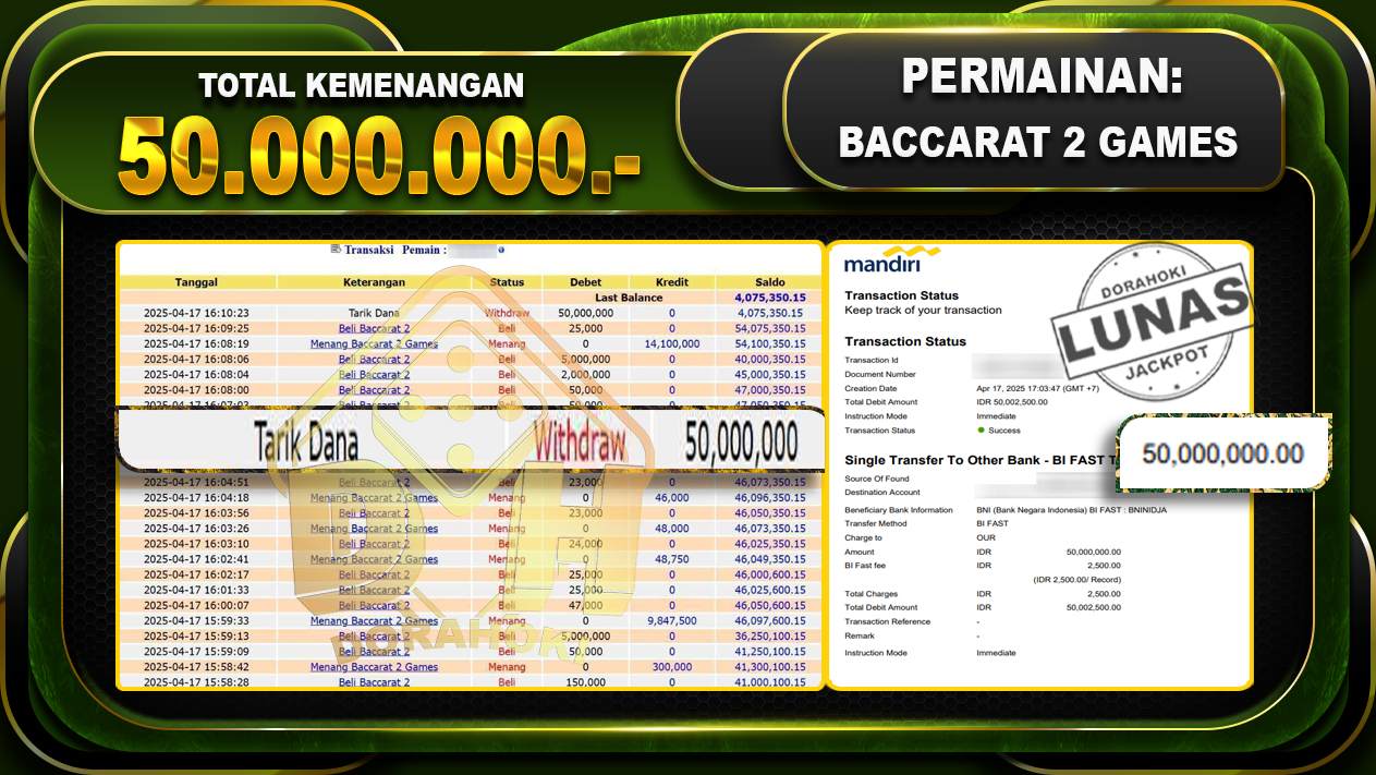 Bukti JP BACCARAT 2 GAMES – ucapkan selamat kepada user id Wahxxx atas kemenangan di  BACCARAT 2 GAMES  dengan total kemenangan Rp.50.000.000,- . Yang pasti nya langsung LUNAS sesuai bukti ya bosku. Dorahoki nih bosku berapapun akan tetap kami bayar lunas ya bosku.