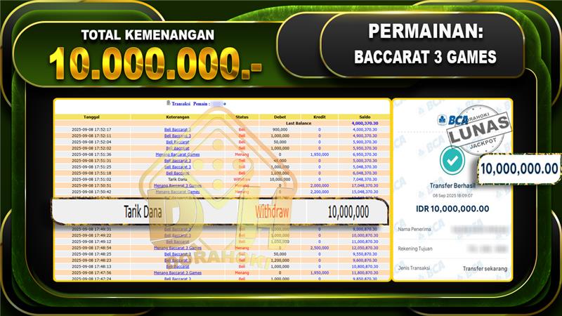 Bukti JP BACCARAT 3 GAMES – Yang kami berikan ini sah dan real tanpa di rekayasa bosku dan hanya bertujuan untuk meningkatkan kepercayaan member kami dan memberikan kenyamanan saat bermain jadi bosku tidak perlu khawatir MENANG BERAPAPUN PASTI KAMI BAYAR LUNAS!!