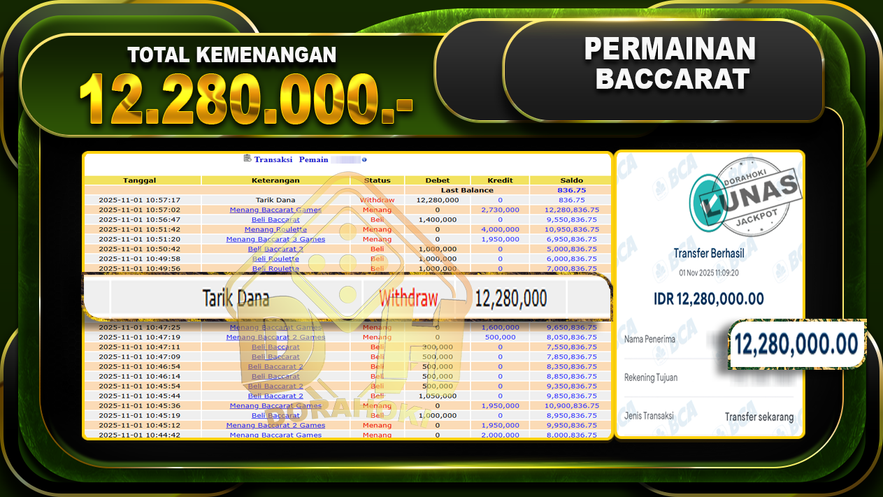 Bukti JP BACCARAT – ucapkan selamat kepada user id asuxxx atas kemenangan di BACCARAT dengan total kemenangan Rp.12.280.000,- . Yang pasti nya langsung LUNAS sesuai bukti ya bosku. Dorahoki nih bosku berapapun akan tetap kami bayar lunas ya bosku.