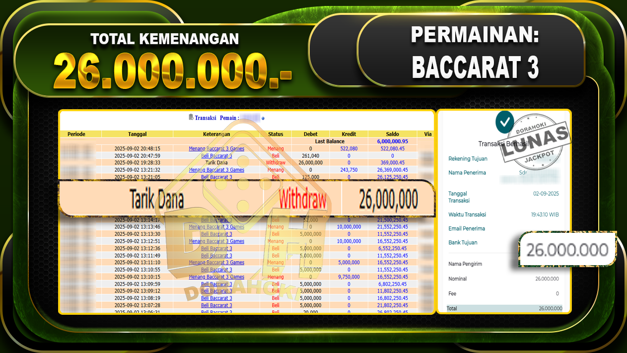 Bukti JP BACCARAT 3 GAMES – ucapkan selamat kepada user id WahXXXX atas kemenangan di BACCARAT 3 GAMES dengan total kemenangan Rp.26.000.000- . Yang pasti nya langsung LUNAS sesuai bukti ya bosku. Dorahoki nih bosku berapapun akan tetap kami bayar lunas ya bosku.