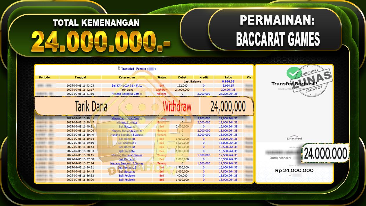 Bukti JP BACCARAT 3 GAMES – Yang kami berikan ini sah dan real tanpa di rekayasa bosku dan hanya bertujuan untuk meningkatkan kepercayaan member kami dan memberikan kenyamanan saat bermain jadi bosku tidak perlu khawatir MENANG BERAPAPUN PASTI KAMI BAYAR LUNAS!!