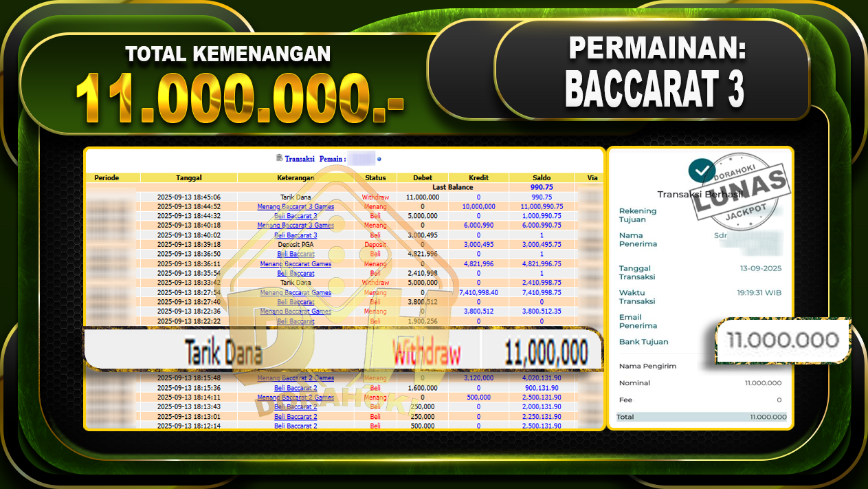 Bukti JP BACCARAT 3 GAMES – ucapkan selamat kepada user id Wahxxxx atas kemenangan di BACCARAT 3 GAMES dengan total kemenangan Rp.11.000.000,- . Yang pasti nya langsung LUNAS sesuai bukti ya bosku. Dorahoki nih bosku berapapun akan tetap kami bayar lunas ya bosku.