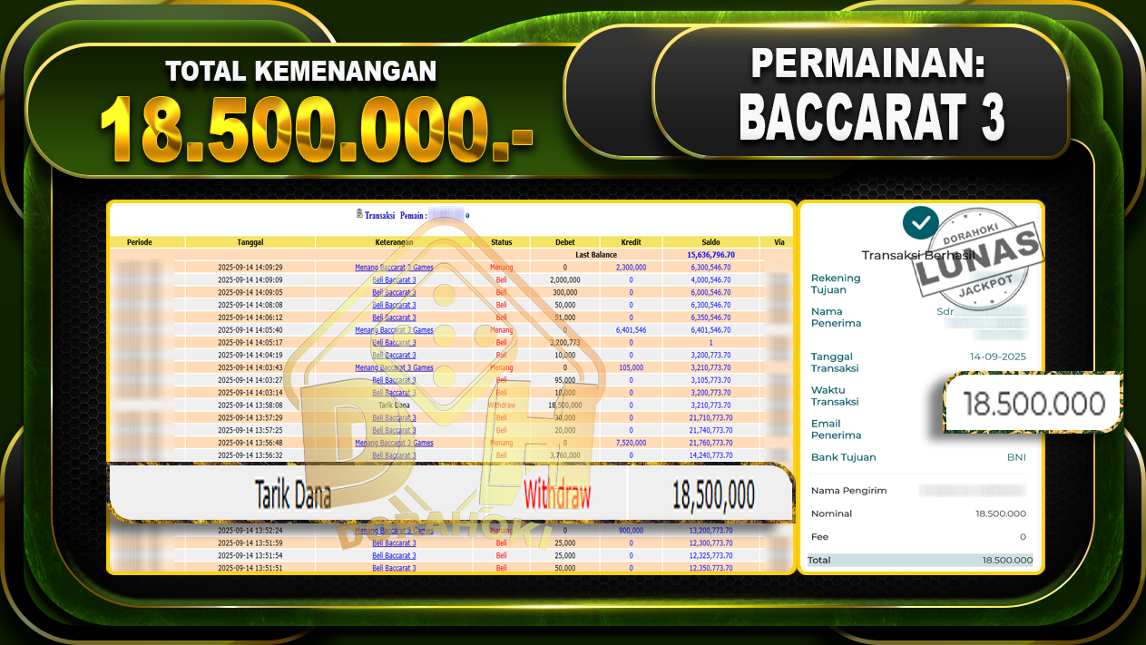 Bukti JP BACCARAT 3 GAMES – ucapkan selamat kepada user id WAHxxx atas kemenangan di BACCARAT 3 GAMES dengan total kemenangan Rp.18.500.000,- . Yang pasti nya langsung LUNAS sesuai bukti ya bosku. Dorahoki nih bosku berapapun akan tetap kami bayar lunas ya bosku.