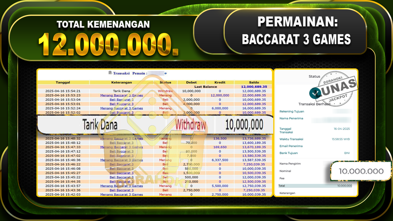 Bukti JP BACCARAT 3 GAMES – ucapkan selamat kepada user id Wahxxx atas kemenangan di BACCARAT 3 GAMES dengan total kemenangan Rp.12.000.000,- . Yang pasti nya langsung LUNAS sesuai bukti ya bosku. Dorahoki nih bosku berapapun akan tetap kami bayar lunas ya bosku.
