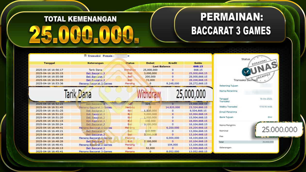 Bukti JP BACCARAT 3 GAMES – ucapkan selamat kepada user id Wahxxx atas kemenangan di BACCARAT 3 GAMES dengan total kemenangan Rp.25.000.000,- . Yang pasti nya langsung LUNAS sesuai bukti ya bosku. Dorahoki nih bosku berapapun akan tetap kami bayar lunas ya bosku.