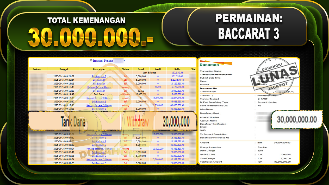 Bukti JP BACCARAT 3 GAMES – ucapkan selamat kepada user id Arkxxxx atas kemenangan di BACCARAT 3 GAMES dengan total kemenangan Rp.30.000.000,- . Yang pasti nya langsung LUNAS sesuai bukti ya bosku. Dorahoki nih bosku berapapun akan tetap kami bayar lunas ya bosku.