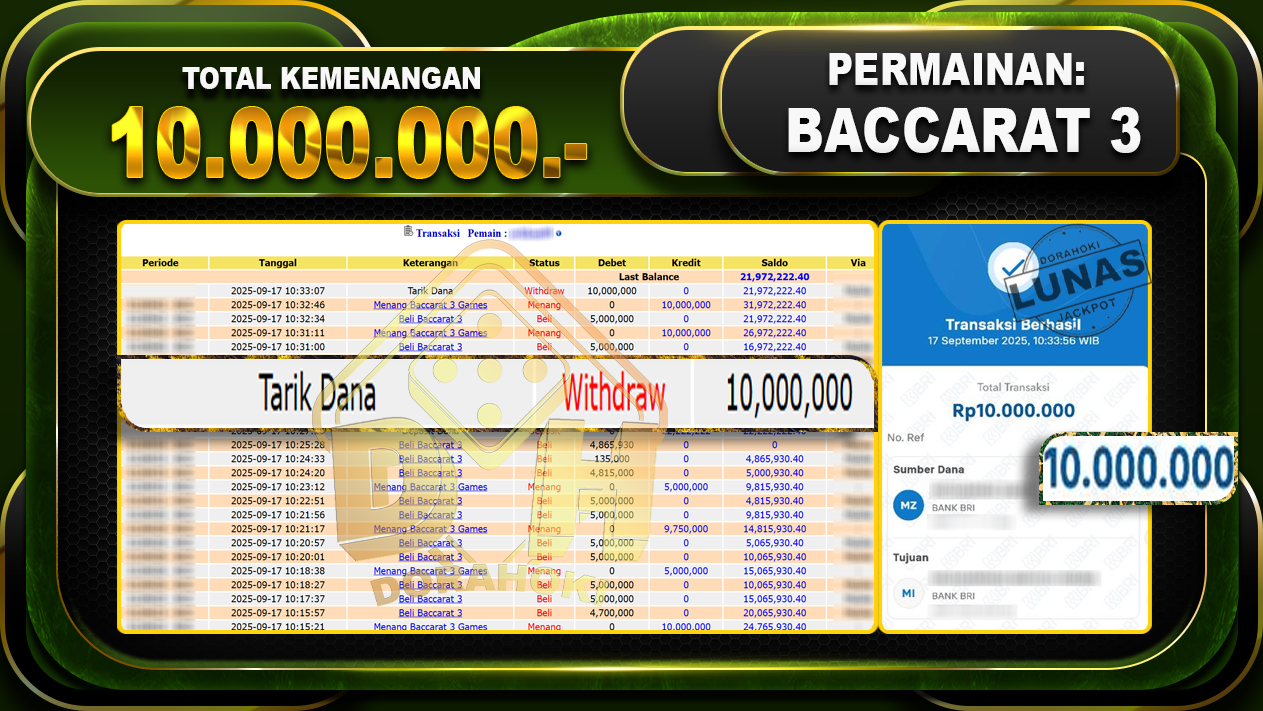 Bukti JP BACCARAT 3 GAMES – ucapkan selamat kepada user id Arkhxxxx atas kemenangan di BACCARAT 3 GAMES dengan total kemenangan Rp.10.000.000,- . Yang pasti nya langsung LUNAS sesuai bukti ya bosku. Dorahoki nih bosku berapapun akan tetap kami bayar lunas ya bosku.