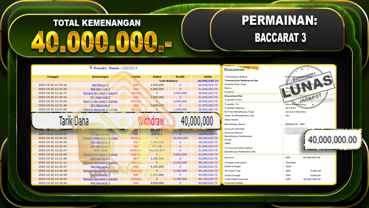 Bukti JP BACCARAT 3 GAMES – ucapkan selamat kepada user id Arxxxx atas kemenangan di BACCARAT 3 GAMES dengan total kemenangan Rp.40,000,000,- . Yang pasti nya langsung LUNAS sesuai bukti ya bosku. Dorahoki nih bosku berapapun akan tetap kami bayar lunas ya bosku.