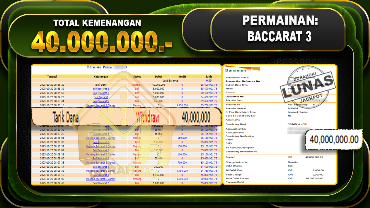 Bukti JP BACCARAT 3 GAMES – ucapkan selamat kepada user id Arkxxxxxx atas kemenangan di BACCARAT 3 GAMES dengan total kemenangan Rp.40,000,000,- . Yang pasti nya langsung LUNAS sesuai bukti ya bosku. Dorahoki nih bosku berapapun akan tetap kami bayar lunas ya bosku.
