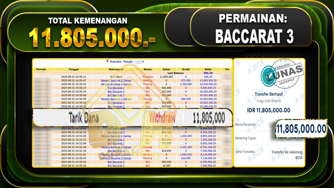Bukti JP BACCARAT 3 GAMES – ucapkan selamat kepada user id Asuxxx atas kemenangan di BACCARAT 3 GAMES dengan total kemenangan Rp.11.805.000- . Yang pasti nya langsung LUNAS sesuai bukti ya bosku. Dorahoki nih bosku berapapun akan tetap kami bayar lunas ya bosku.