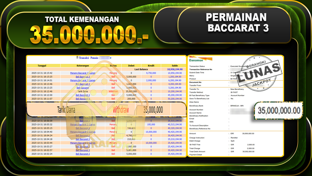Bukti JP BACCARAT – ucapkan selamat kepada user id arkxxxxx atas kemenangan di BACCARAT dengan total kemenangan Rp.35.000.000,- . Yang pasti nya langsung LUNAS sesuai bukti ya bosku. Dorahoki nih bosku berapapun akan tetap kami bayar lunas ya bosku.