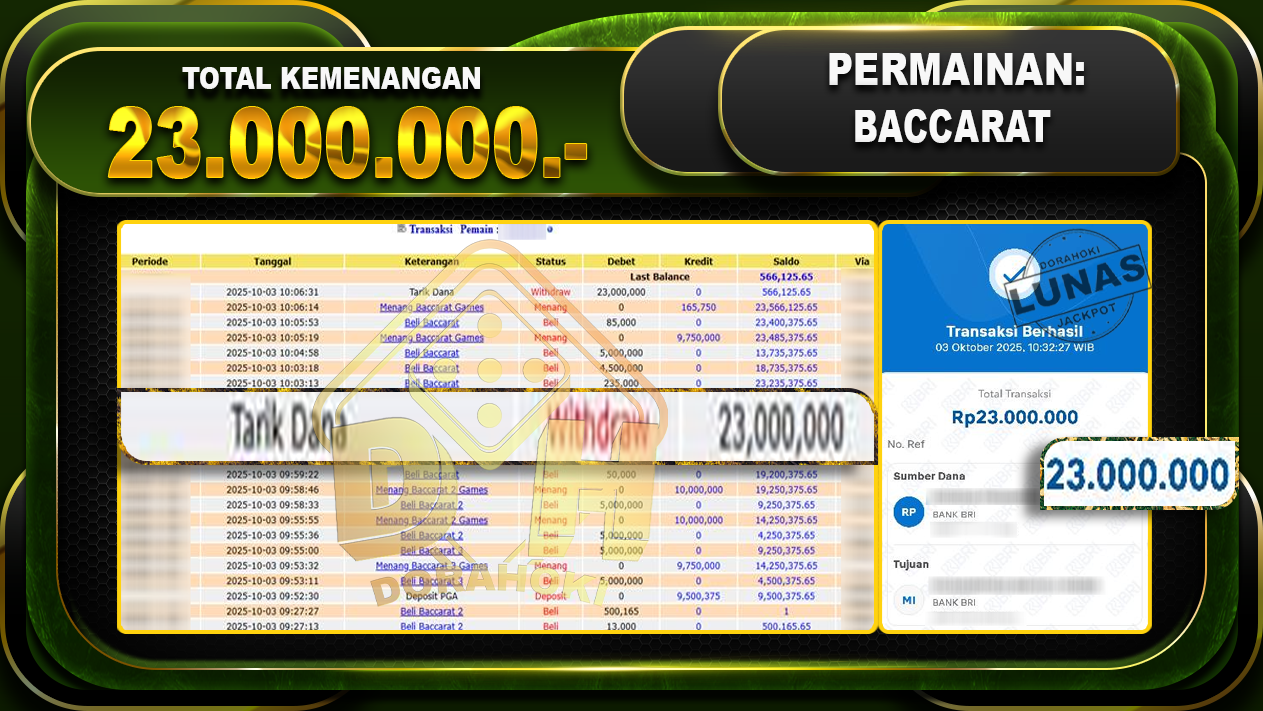 Bukti JP Baccarat – ucapkan selamat kepada user id arkxxxxxx atas kemenangan di Baccarat dengan total kemenangan Rp.23.000.000- . Yang pasti nya langsung LUNAS sesuai bukti ya bosku. Dorahoki nih bosku berapapun akan tetap kami bayar lunas ya bosku.